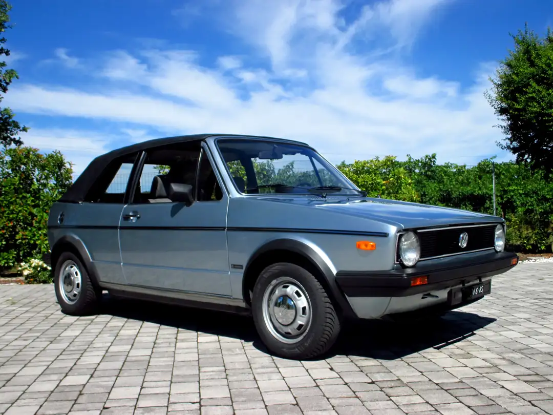 VW Golf mk1 prima serie cabrio, versione GL, vettura immatricolata in Italia nel 1982, targhe originali di prima immatricolazione, motorizzazione 1.5 benzina, 5 marce, 70cv, colore originale raro azzurro cosmo, completa di tutti i documenti, compreso storico tagliandi fino al 1991, doppie chiavi, iscritta ASI e rilasciato CRS. L'auto è stata rinfrescata di verniciatura anni fa, colore originale LK5Y come riportato sugli adesivi ancora presenti nel bagagliaio, è sana e non necessita di interventi. Presenta qualche segno legato all'età come si vede nei dettagli di alcune foto, qualche bozzetta sulle fiancate ma non scalfiture profonde o ruggine; fondi sani. Piccolo segno sull'angolo sinistro del paraurti posteriore. Meccanica e motore in ordine, appena tagliandata e revisionati: carburatore, guarnizione coperchio valvole, servofreno, candele, tubi benzina, filtro benzina, cavo frizione, aspirazione e radiatore; non necessita di alcun intervento. Gomme nuove anteriori e al 90% posteriori, pastiglie freni anteriori nuove, convergenza appena eseguita. Interni conservati in ottimo stato, non necessitano di alcun intervento. Impianto elettrico revisionato. Capotte in ottimo stato, senza segni di usura o rotture; inclusa capottina copri capotte abbassata (vedi foto) di colore blue con relativa sacca. Autoradio optional originale dell'epoca funzionante. Auto tutta originale, affidabile e guidabile nella quotidianeità. Contattatemi per la serie completa di foto o visionare l'auto di persona. L'auto si trova in Italia, a Carpi 41012 MO.